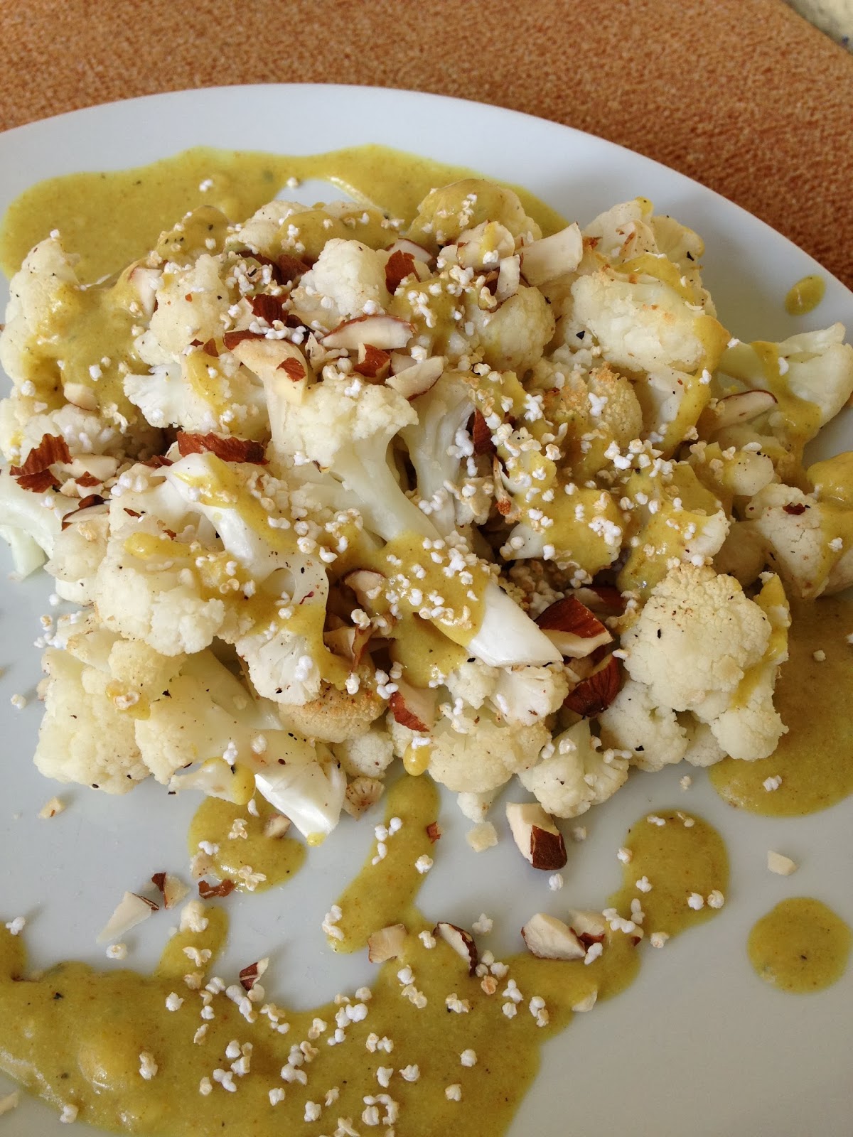Blumenkohl aus dem Dampfgarer mit Currysauce, Mandeln und gepoppten Amaranth.